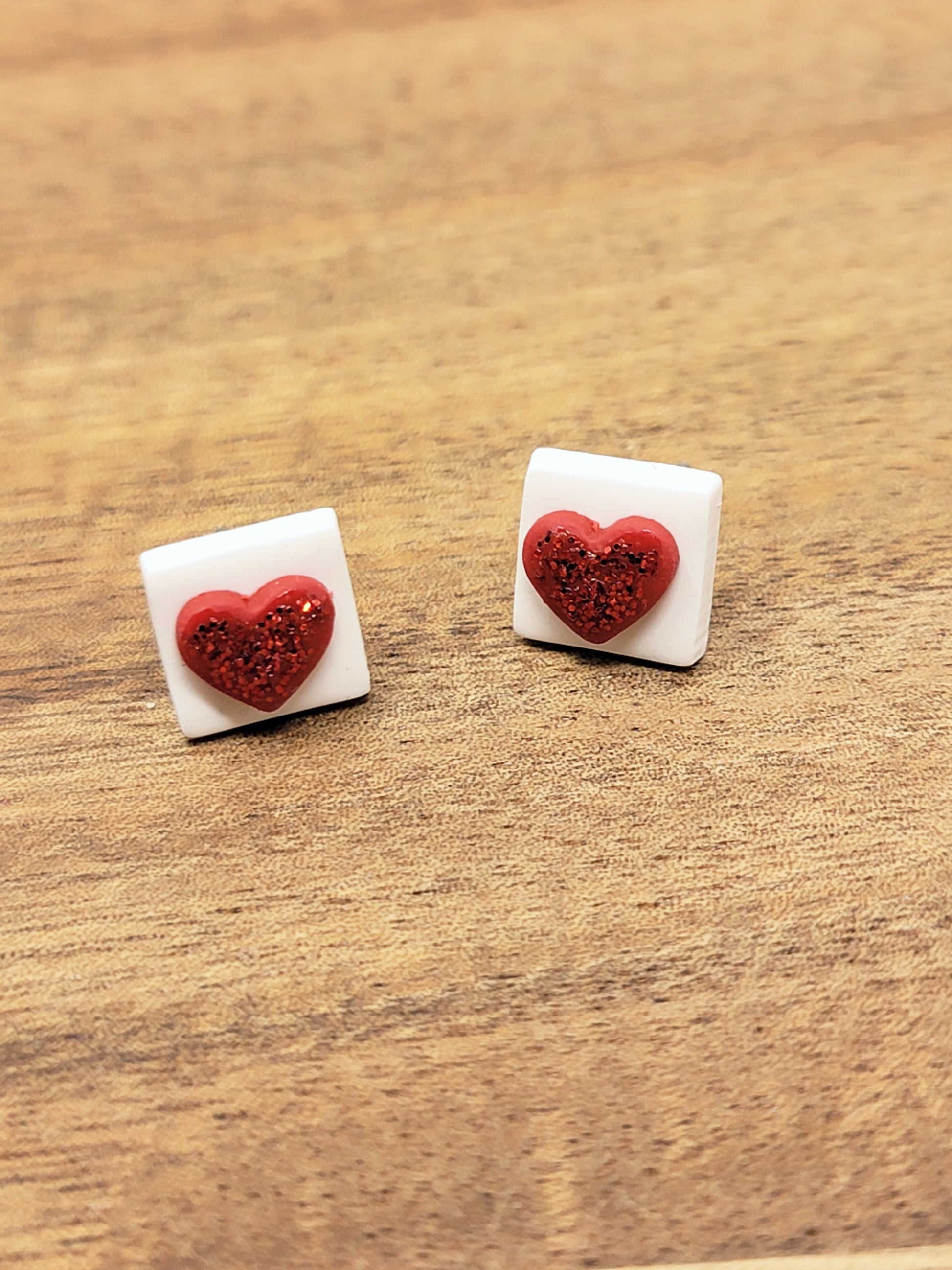 White square studs with glittery red heart